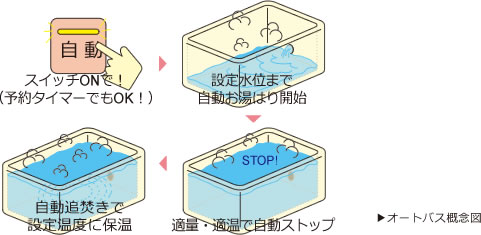 バスルームにはオートバスを採用しました。リモコンで簡単・便利に操作が可能。スイッチポンでお風呂沸かしができるほか、沸きあがり0〜8時間の追焚き・自動保温などもこなせます。